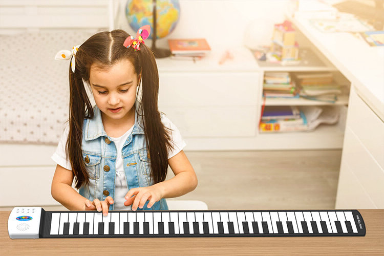 手卷电子琴,顾名思义,是一种可以卷起折叠的电子键盘乐器。它的设计灵感源于对传统钢琴占用空间大、不便携带等问题的深刻洞察,通过现代科技的创新应用,实现了乐器的小型化和便携化。这种设计不仅使得手卷电子琴能够轻松放入背包或行李箱,方便小朋友在任何时间、任何地点进行音乐练习和表演,还极大地降低了学习音乐的门槛,让音乐之光能够照亮更多孩子的童年。
